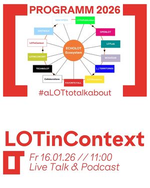 Fr 16.01.2026, von 11:00 bis 13:00 Uhr Kategorie : allgemeine Veranstaltungen LOTinContext: Jahresprogramm 2026![]() Offenes Pressegespräch & Austausch LOTinContext ist der Raum, in dem wir innehalten, reflektieren und unsere Arbeit in einen größeren Zusammenhang stellen. Zum Jahresauftakt 2026 öffnen wir dieses Format bewusst nach außen – als offenes Pressegespräch mit Gespräch, Brunch und Austausch. Am 16. Jänner 2026 präsentieren wir das Jahresprogramm von Das LOT: nicht als fertigen Plan, sondern als lebendigen Prozess zum andocken. Im Zentrum steht ein Runder Tisch mit Live-Podcast, an dem das Team von ECHOLOT über neue Arbeitsweisen, künstlerische Forschung und den Aufbau eines vernetzten Ecosystems spricht. 2026 bündeln wir erstmals zehn Formate zu einem gemeinsamen künstlerischen Kreislauf – von offenen Arbeitsräumen über Konzerte, Performances, Ausstellungen und Audiowalks bis hin zu Diskurs- und Publikationsformaten. Im Fokus stehen Austausch, Feedback und langfristige Entwicklung statt einzelner Premieren. Ein besonderer Schwerpunkt ist der Start des zweijährigen Research-Zyklus „Remembering the Future“, der sich mit Erinnerung, Technologie und Zukunftsbildern beschäftigt und alle Formate inhaltlich verbindet. Das Gespräch wird ergänzt durch visuelle Materialien, Einblicke in kommende Projekte (u. a. OPENLOT, [AR]TWALK, [FUTURE] TERRITORIES, FAVORITE FALL) sowie Raum für persönlichen Austausch bei Brunch und DJ-Set. Preis : Freier EintrittVorverkauf : Freier EintrittErmäßigung : Freier Eintritt Veranstaltungsort Das LOT, Wien Absberggasse 31/2 1100 Wien,Favoriten | Werbung : Ihre Werbung auf dieser Seite! Veranstaltungen Jetzt Ihre Veranstalungen KOSTENLOS in unserem Veranstaltungskalender Netzwerk eintragen! --> weitere Informationen Unser Netzwerk Wussten Sie, das die Informationen auf dieser Internetseite, nicht nur hier auf Wien24.net erscheinen, sondern auch auf jeder thematisch und geografisch passenden Internetadresse unseres Domain Netzwerk ausgeliefert werden. Mehr über die Möglichkeiten die dir das RootWeb.EU Domain Netzwerk bieten kann, erfährst du hier erfahre mehr über deine Möglichkeiten! Wussten Sie, das zu unserem Domain Netzwerk auch Veranstaltungskalender.net gehört, einer der größten Veranstaltungskalender in Österreich, auf dem Sie kostenlos Ihrer Veranstaltungen eintragen können. www.veranstaltungskalender.net |
