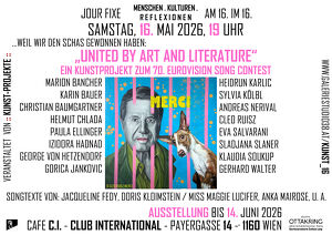 Sa 16.05.2026 19:00 Uhr, bis So 17.05.2026 00:00 täglich ab 10 Uhr Kategorie : Ausstellung & Präsentation Der Song Contest als Kunst-Event zum Mitmachen!![]() Jour fixe am 16. im 16. „70 Jahre Song Contest – United by Art & Literature“. Gruppenausstellung und Lesung Bilder: Marion Bancher, Karin Bauer, Christian Baumgartner, Helmut Chlada, Paula Ellinger, Izidora Hadnad, George von Hetzendorf, Gorica Jankovic, Heidrun Karlic, Sylvia Kölbl, Andreas Nerival, Cleo Ruisz, Eva Salvarani, Sladjana Slaner, Klaudia Soukup, Gerhard Walter. Songtexte: Jacqueline Fedy, Doris Kloimstein / Miss Maggie Lucifer, Anka Mairose, Eva Salvarani u. a. www.galeriestudio38.at/KUNST_16 Präsentation der Ausstellung: Sonntag, 31. Mai 2026, 16 Uhr Literatur am Sonntagnachmittag Ausstellung bis 14. Juni 2026 Anlässlich des 70. Eurovision Song Contests 2026 in Wien veranstaltet der Verein kunst-projekte beim Finale am 16. Mai ebenfalls einen „Contest“ – allerdings für bildende Kunst und Literatur mit einem vierwöchigen Online-Bildvoting ab Mitte April, einer Siegerehrung und Preisverleihung für die Mitwirkenden und das Publikum bei der Vernissage mit Lesung. Natürlich besteht auch die Möglichkeit, den "echten" Song Contest live mitzuverfolgen. Dem Aufruf an Kunstschaffende aus den Bereichen Malerei, Fotografie und Literatur, sich an diesem Projekt zu beteiligen, wurde auf vielfältige und kreative Weise Rechnung getragen. Es wurden Werke in verschiedenen künstlerischen Techniken zum Thema Song Contest eingereicht, die einerseits Hommagen an einzelne Protagonisten und Song Contest-Gewinner sind, andererseits als Plattencover dienen können. Auch neue Songtexte wurden geschrieben – regelkonform von maximal 3 Minuten Länge. Nicht nur Menschen, auch ein schreibendes Pferd und ein malender Hund nehmen am Wettbewerb teil. Mittels Online-Voting wird ein Siegerbild – das mit den meisten Publikumsstimmen - ermittelt. Die Werke werden der Fairness halber anonymisiert präsentiert. Auch vor Ort kann vom Publikum ebenfalls noch einmal gevotet werden – für die Bilder und für die Texte. Die Siegerehrung mit Preisverleihung erfolgt dann bei der Vernissage. Preis : Freier EintrittVorverkauf : Freier EintrittErmäßigung : Freier Eintritt Veranstalter Ursula Pfeiffer verein ::kunst-projekte:: zvr 12361215506801282380 Mail an den Veranstalter Veranstaltungsort Cafe C.I. - Club International Payergasse 14 1160 Wien - Ottakring (Offspace, Kunst, Literatur, Jour fixe am 16. im 16.) | Werbung : Ihre Werbung auf dieser Seite! Veranstaltungen Jetzt Ihre Veranstalungen KOSTENLOS in unserem Veranstaltungskalender Netzwerk eintragen! --> weitere Informationen Unser Netzwerk Wussten Sie, das die Informationen auf dieser Internetseite, nicht nur hier auf Wien24.net erscheinen, sondern auch auf jeder thematisch und geografisch passenden Internetadresse unseres Domain Netzwerk ausgeliefert werden. Mehr über die Möglichkeiten die dir das RootWeb.EU Domain Netzwerk bieten kann, erfährst du hier erfahre mehr über deine Möglichkeiten! Wussten Sie, das zu unserem Domain Netzwerk auch Veranstaltungskalender.net gehört, einer der größten Veranstaltungskalender in Österreich, auf dem Sie kostenlos Ihrer Veranstaltungen eintragen können. www.veranstaltungskalender.net |