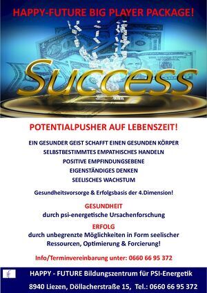 Fr 17.04.2026 09:00 Uhr, bis Fr 24.04.2026 18:00 Kategorie : Gesundheit & Wellness (ONLINE) Beratung zum Thema: GESUNDHEITSVORSORGE & ERFOLGSBASIS![]() BIG PLAYER PACKAGE - POTENTIALPUSHER AUF LEBENSZEIT Erfahren Sie, wie eine Innovation aus der PSI-Forschung Ihr Leben verändern kann! Diese Maßnahme aus dem Wissenschaftsgebiet der PSI-Forschung bringt Sie körperlich und geistig rasch in Form! Es gibt nichts Vergleichbares! - viele Ideen, aber es scheitert an der Umsetzung? - Bestmögliche Voraussetzungen wurden Ihrerseits bereits geschaffen, doch der erwünschte Erfolg bleibt dennoch aus? - Verletzungspech, Nervosität, Versagensängste machen Ihnen ständig einen Strich durch die Rechnung? - Physiologisch top fit, doch mentale Schwächen werfen Sie immer wieder aufs Neue zurück? - Unerklärliche Problematiken erschweren Ihre Vorhaben / Ihre Zielsetzung? - Schaffenskrise, kreatives Loch, motivationslos, momentane Leere? - Druck durch Neider, Konkurrenz, Rivalität? - Durchschnittlich gut, aber Sie spüren es ginge noch mehr, noch besser? Ein erfolgsorientierter Mensch beabsichtigt seine Ziele auch tatsächlich umzusetzen, seine Visionen und Vorhaben, wahr werden zu lassen. Dazu bedarf es oftmals Mut, Ausdauer, Resonanzunabhängigkeit und entsprechender Geduld. Es bedarf an Motivation, der Kompetenz zur Umsetzung, der inneren Bereitschaft sich weiter entwickeln zu wollen und der geistigen Freiheit, seine vermeintlichen Grenzen überschreiten zu wollen. Visionen und Träumereien können und werden sich real umsetzen lassen, wenn der Mensch auf allen Ebenen seines Seins von einem gesunden Fundament profitiert - physiologisch, neurologisch, biologisch, mental und emotional. Gewinnen auch Sie von dieser einzigartigen und unbegrenzten Möglichkeit, auf allen Ebenen des Seins. EIN GESUNDER GEIST SCHAFFT EINEN GESUNDEN KÖRPER POSITIVE EMPFINDUNGSEBENE SEELISCHES WACHSTUM EIGENSTÄNDIGES DENKEN SELBSTBESTIMMTES EMPATISCHES HANDELN Ein Alleskönner an ihrer Seite, ein Leben lang! Alle Gesundheits- und Erfolgsinnovationen, entstammen aus dem einzigartigen Know-how aus wissenschaftlicher Arbeit des PSI-Forschers, Experte für Psychotronik, Spezialist für Psychokinese - W. Robé. Seine Arbeit basiert nicht auf Hypothesen, sondern auf Beweisen. Die PSI-Forschung entwickelt Problemlöser und steht für eine neue Bewusstseinsschaffung für sämtliche psi(seelische)- und bioenergetische Gesundheitsinnovationen mit Nachhaltigkeit. Ihr Interesse wurde geweckt, vereinbaren Sie sich Ihren Beratungstermin! Die Möglichkeit der Beratung, haben Sie an beiden HAPPY-FUTURE Standorten! HAPPY-FUTURE Spirit-Wellness Shop & Bildungszentrum für PSI-Energetik, A-8940 Liezen, Döllacherstraße 15, Terminvereinbarung unter: +43 (0)660 / 66 95 372 bilungszentrum.stmk@team-happy-future.at Öffnungszeiten: Mo, Di, Do, Fr, 09:00 -12:00 Uhr, 14:00 - 18:00 Uhr Mi, 09:00 - 12:00 Uhr und HAPPY-FUTURE Spirit-Wellness OG 4020 Linz, Rudigierstraße 1, 3.Stock Terminvereinbarung unter: +43 732 94 27 87 office@happy-future.at Telefonisch erreichbar: Montag - Freitag: 09:00 - 18:00 Uhr www.psy-energetic.com www.happy-future.at Ermäßigung : 120,00 Veranstaltungsort HAPPY-FUTURE Zentrum für PSI-Energetik 1150 Wien - Rudolfsheim-Fünfhaus | Werbung : Ihre Werbung auf dieser Seite! Veranstaltungen Jetzt Ihre Veranstalungen KOSTENLOS in unserem Veranstaltungskalender Netzwerk eintragen! --> weitere Informationen Unser Netzwerk Wussten Sie, das die Informationen auf dieser Internetseite, nicht nur hier auf Wien24.net erscheinen, sondern auch auf jeder thematisch und geografisch passenden Internetadresse unseres Domain Netzwerk ausgeliefert werden. Mehr über die Möglichkeiten die dir das RootWeb.EU Domain Netzwerk bieten kann, erfährst du hier erfahre mehr über deine Möglichkeiten! Wussten Sie, das zu unserem Domain Netzwerk auch Veranstaltungskalender.net gehört, einer der größten Veranstaltungskalender in Österreich, auf dem Sie kostenlos Ihrer Veranstaltungen eintragen können. www.veranstaltungskalender.net |