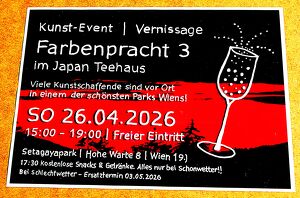 Do 16.04.2026, von 15:00 bis 19:00 Uhr Kategorie : allgemeine Veranstaltungen Vernissage mit gratis Happy Hour / Snacks+Getränke![]() Zum Vormerken !! >>> Robin der Künstler präsentiert NEUES der zeitgenössischen Gemäldekunst, die in seinem erfundene Stil des „Neofließ Realismus“ gefertigt sind, in einem der schönsten Parks von Wien. Der Kunstschaffende bekannt für seine vielen Ausstellungen / Events auch im öffentlichen Raum, zeigt seine Werke immer wieder an möglichen als auch unmöglichen Orten. Da gibt es unter anderem auch "Prickelnde Kunst" zu sehen, die er mit Sekt geschaffen hat"! Diese Show soll wie immer in volkstümlicher Art präsentiert werden, wo auch hin und wieder andere Künstler*innen hier mit dabei sind, um ihre zeitgenössische Kunst zeigen zu können. So ladet er all jene die für Kunst und Natur interessiert sind, recht herzlichst zur Vernissage ein.Diesmal ist seine Show im Japan Park Setagaya in Döbling beim Teehaus angesagt, da dieses nur zu besonderen Anlässen seine Pforten öffnet. So kann auch das Teehaus besichtigt werden, dieses befindet sich in einem der schönsten Parks von Wien! Bei dieser Frischluftausstellung, kann JUNG und ALT auch echte Natur und Kunst, bei Eintritt frei, genießen!! So gibt es einen Aufruf, „Komm vorbei, bei Eintritt frei und sei dabei!“ Die Vernissage: „Farbenpracht 3“ Sonntag, 26. April 2026 Ab 15:00 geht es los im Japan Teehaus Setagaya Park I Hohe Warte 8 I Wien 1190 17:30 Uhr gibt es kostenlos Snacks & Getränke* solange der Vorrat reicht! Da kann man bei einem Getränk mit den anwesenden Künstlerinnen und Künstlern ins Gespräch kommen, die auch gerne Auskunft über Kunst und Kultur geben. Die Ausstellung ist von 15:00 – 19:00 Uhr geöffnet. Alles nur bei Schönwetter, sonst wird verschoben auf kommenden Sonntag 3. Mai zur gleichen Uhrzeit! Der Park ist täglich geöffnet!! Preis : KostenlosVorverkauf : KostenlosErmäßigung : Kostenlos weitere Informationen zur Veranstaltung :Anfrage an den Veranstalter Veranstaltungsort Vernissage mit gratis Happy Hour / Snacks+Getränke 1210 Wien - Floridsdorf | Werbung : Ihre Werbung auf dieser Seite! Veranstaltungen Jetzt Ihre Veranstalungen KOSTENLOS in unserem Veranstaltungskalender Netzwerk eintragen! --> weitere Informationen Unser Netzwerk Wussten Sie, das die Informationen auf dieser Internetseite, nicht nur hier auf Wien24.net erscheinen, sondern auch auf jeder thematisch und geografisch passenden Internetadresse unseres Domain Netzwerk ausgeliefert werden. Mehr über die Möglichkeiten die dir das RootWeb.EU Domain Netzwerk bieten kann, erfährst du hier erfahre mehr über deine Möglichkeiten! Wussten Sie, das zu unserem Domain Netzwerk auch Veranstaltungskalender.net gehört, einer der größten Veranstaltungskalender in Österreich, auf dem Sie kostenlos Ihrer Veranstaltungen eintragen können. www.veranstaltungskalender.net |